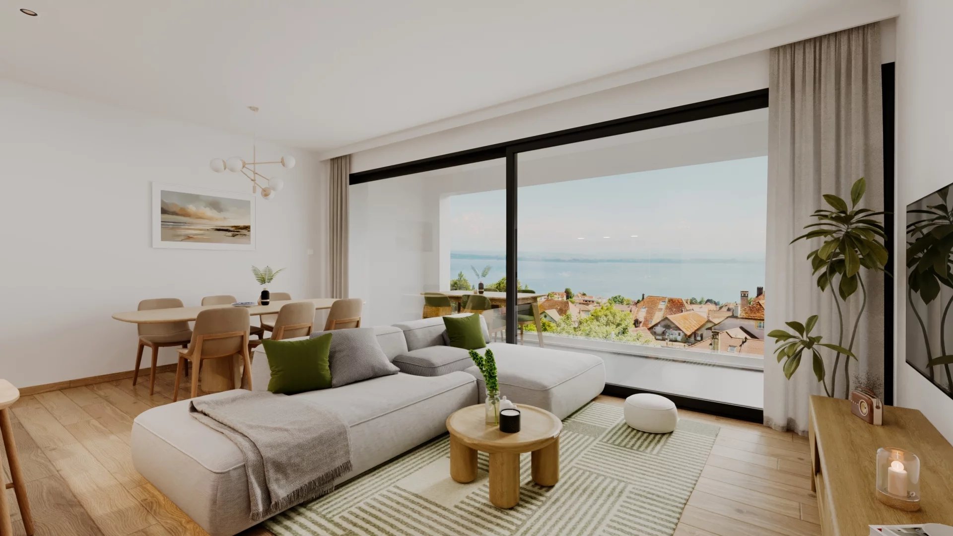 Ce confortable duplex de 4.5 pièces disposant d’une vue lac et alpes, se distribue sur 2 niveaux : le rez-de-chaussée et le 1er étage.