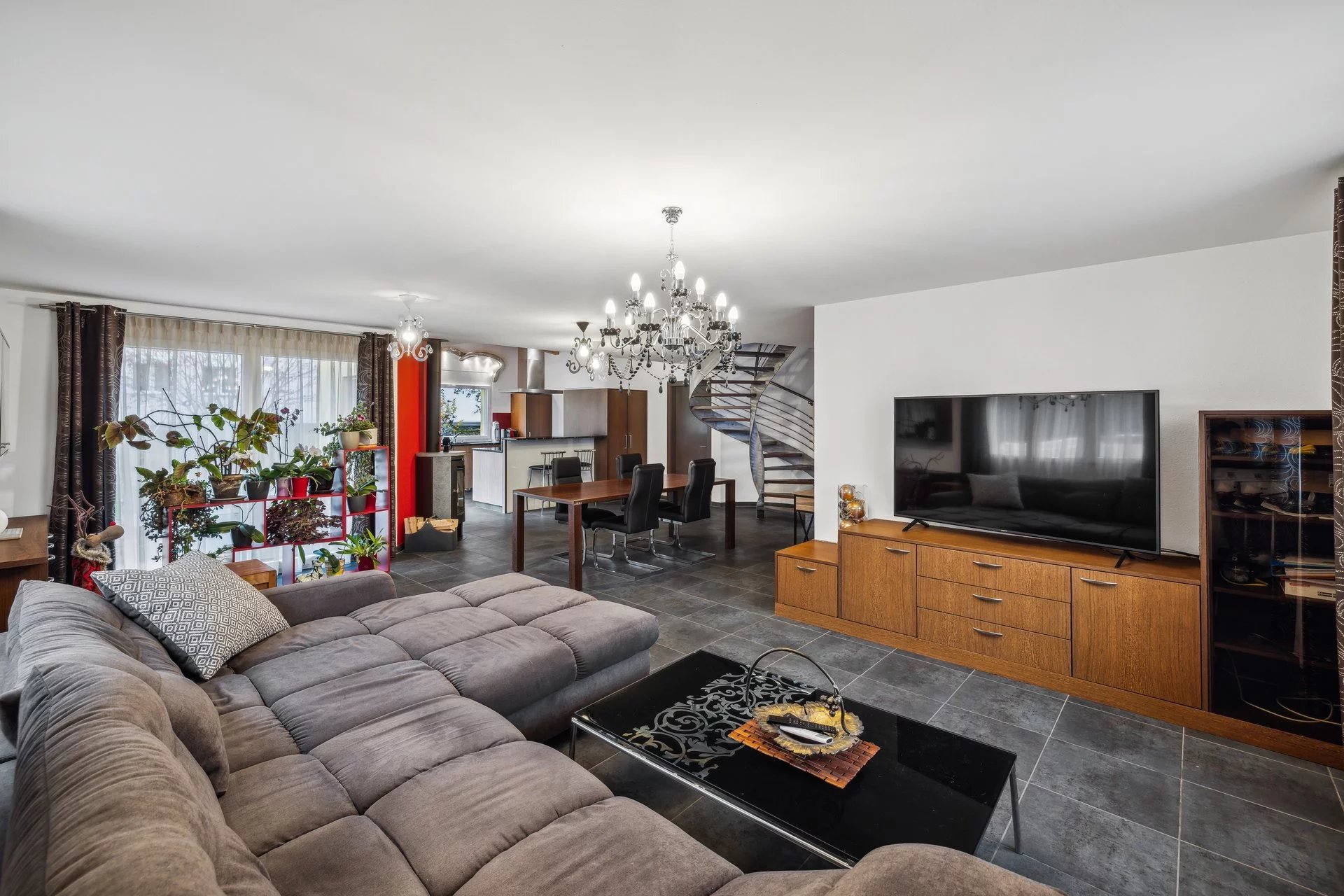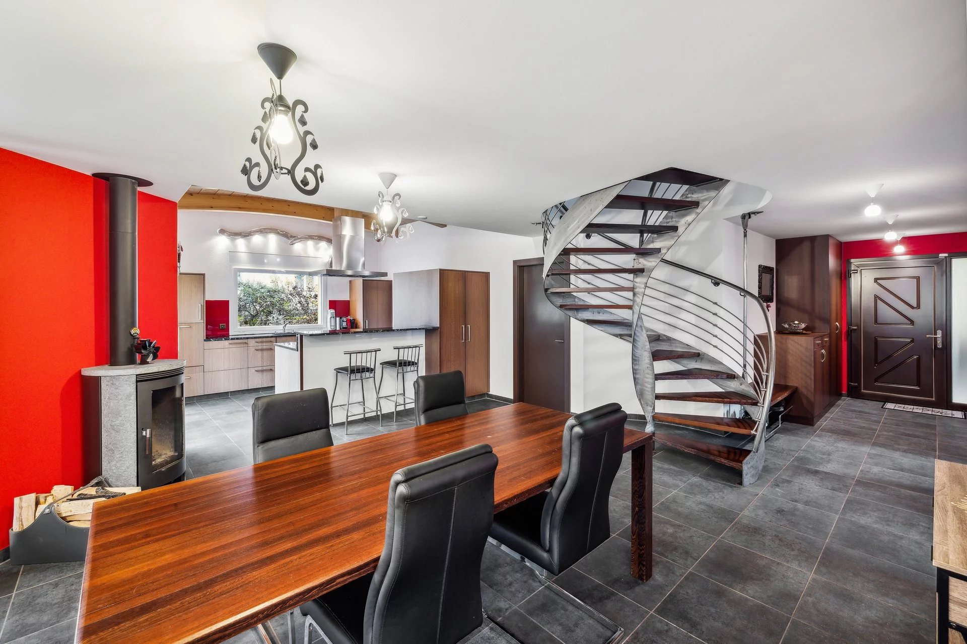 Pièce de vie spacieuse et lumineuse avec salle à manger centrale, poêle à bois et coin salon