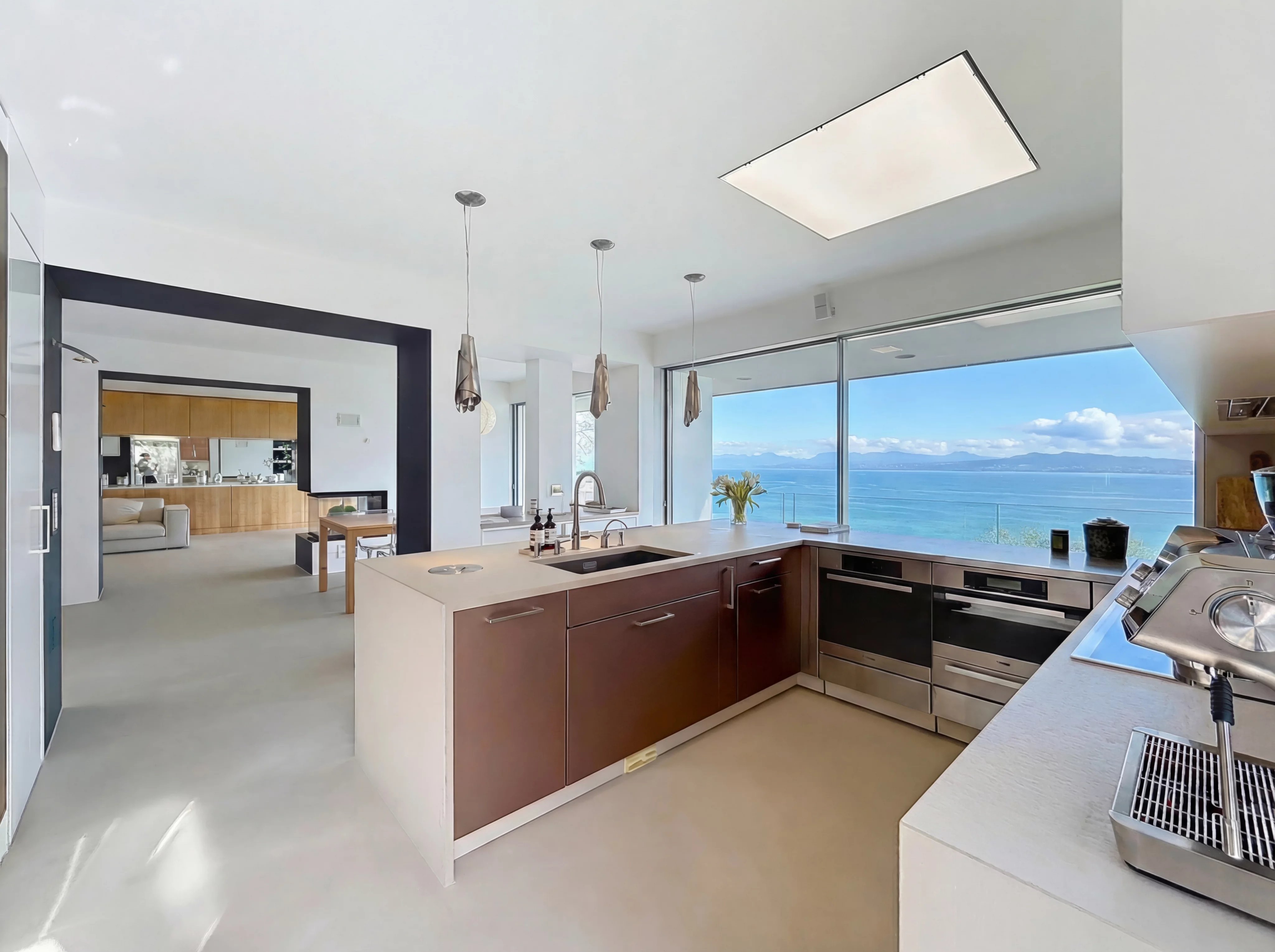 Les espaces de réception s’ouvrent naturellement vers l’extérieur, créant une continuité fluide entre les terrasses et le paysage lacustre. La cuisine principale, réalisée avec des matériaux haut de gamme et équipée d’électroménager de dernière génération, allie précision esthétique et fonctionnalité exigeante.