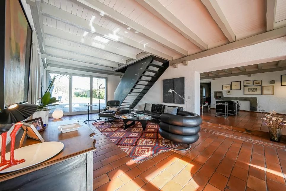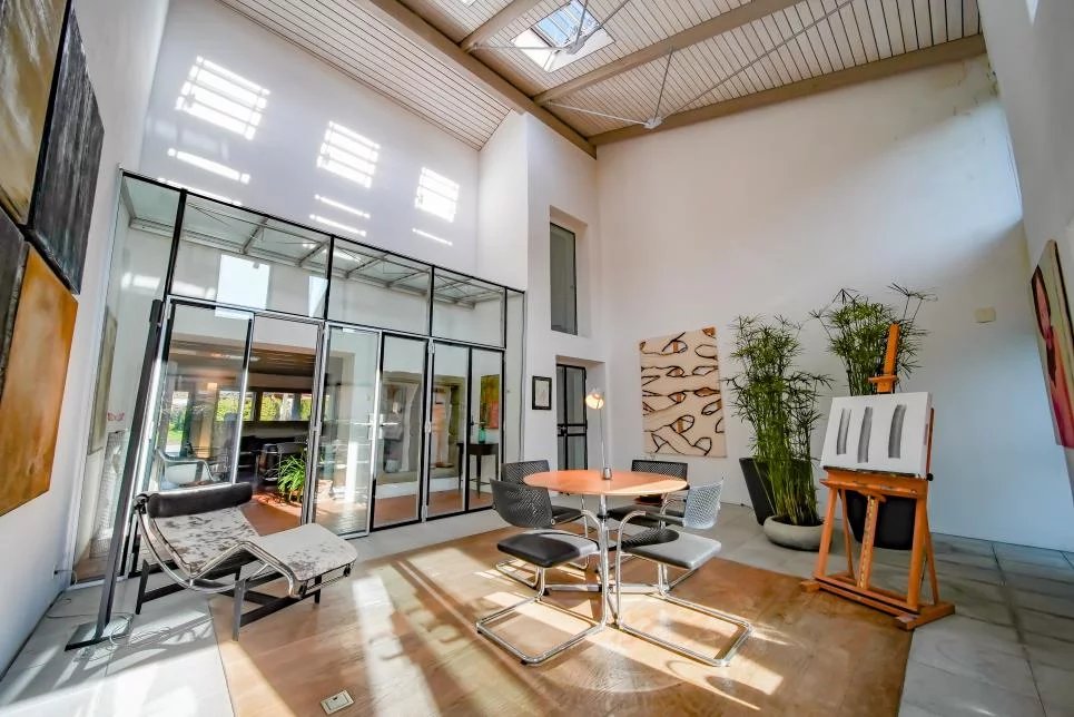 Au rez-de-chaussée, on découvre le hall d’entrée, deux salons, une salle à manger avec cheminée, une bibliothèque avec cheminée, un atelier d’artiste, une cuisine dinatoire, une salle d’eau avec WC et des WC séparés.