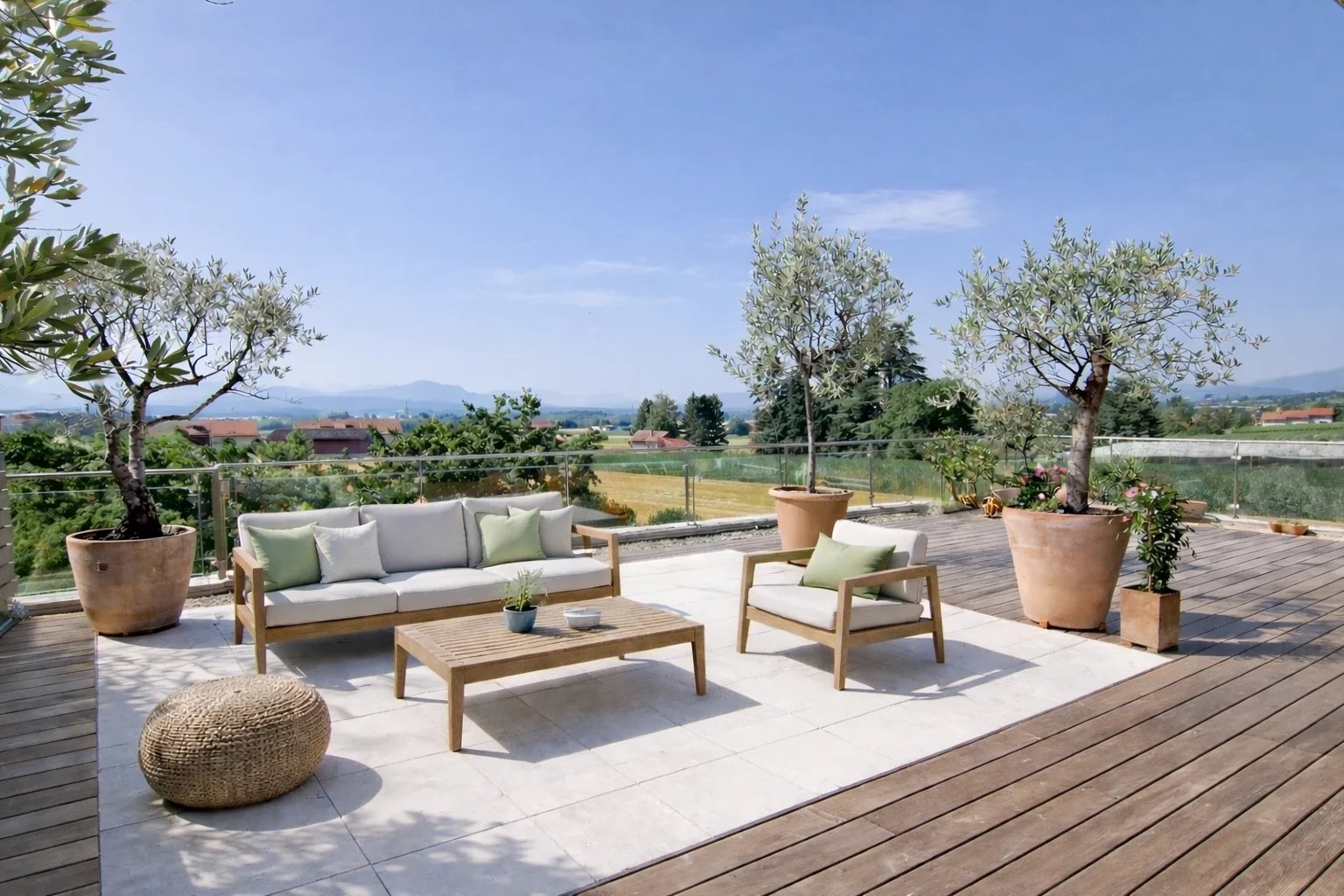 Baigné de lumière et orienté vers une vue imprenable sur les Alpes, ce lieu offre un cadre idéal pour recevoir ou profiter pleinement des beaux jours dans un environnement naturel d’exception